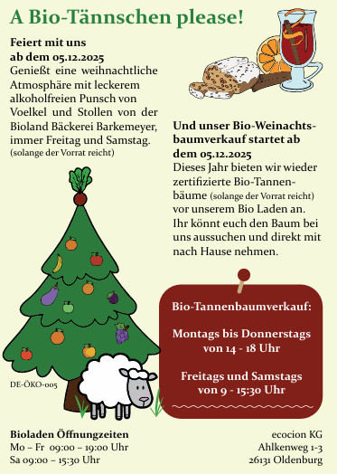 Auch dieses Jahr starten wir ab dem 05.12.2025 wieder mit unserem Bio-Weihnachtsbaumverkauf vor dem Laden.
